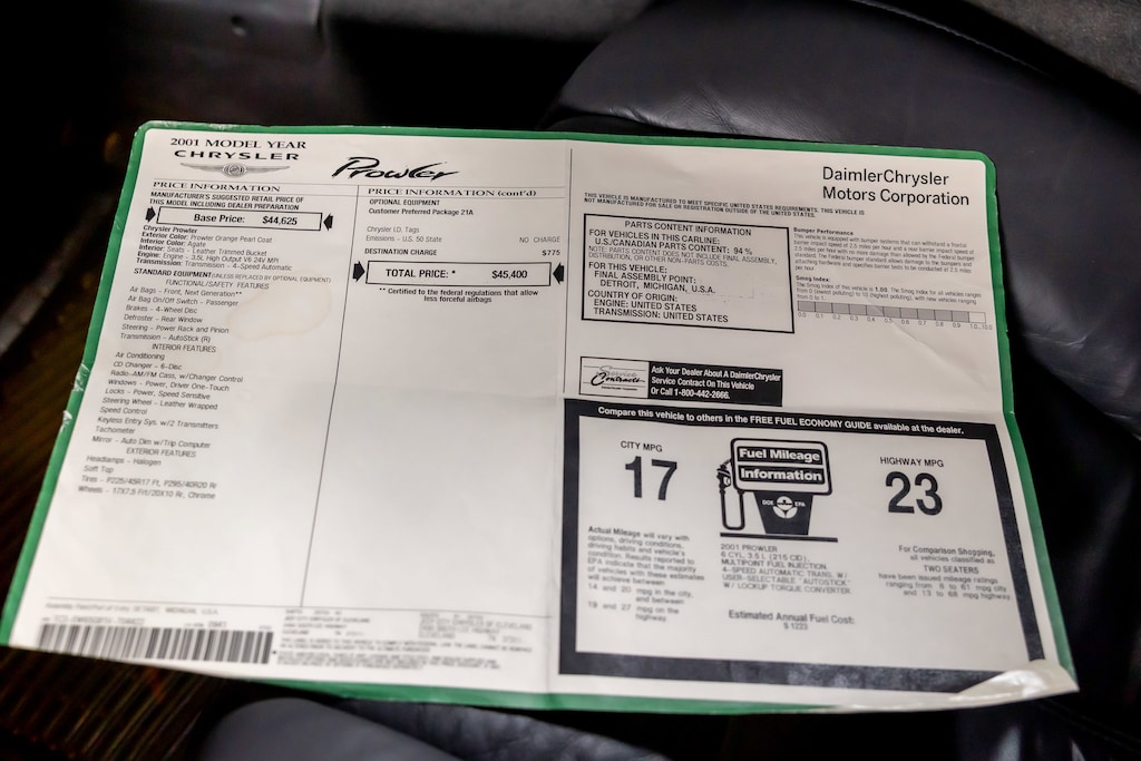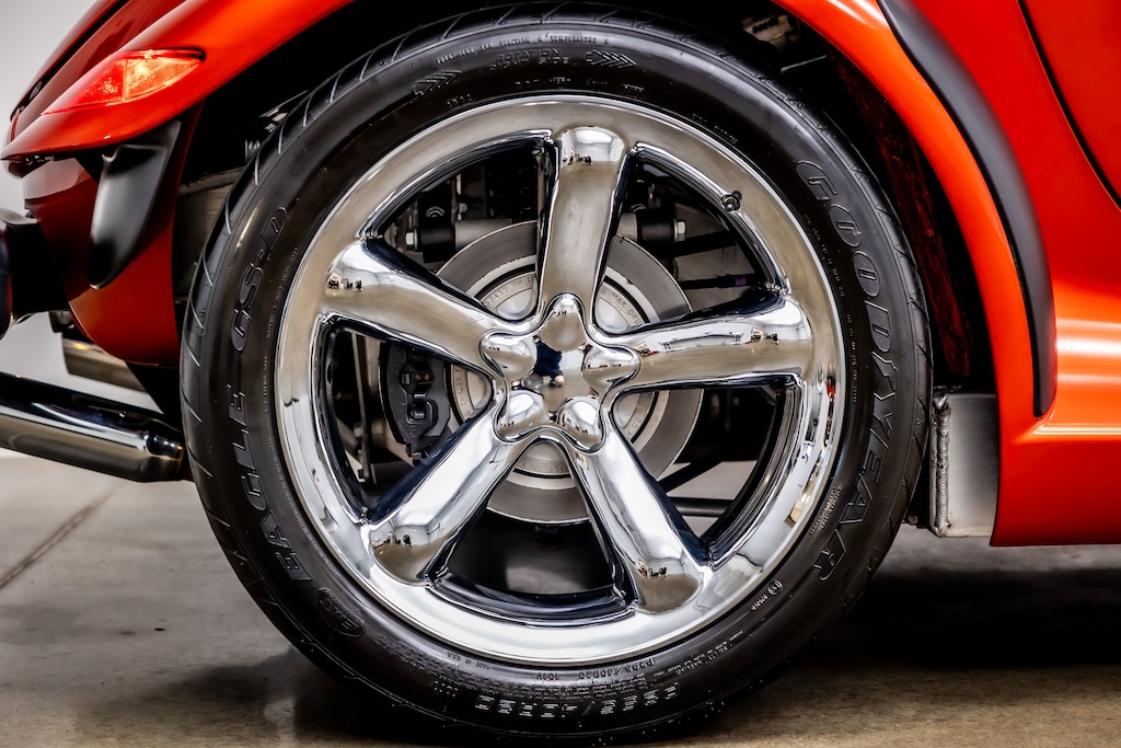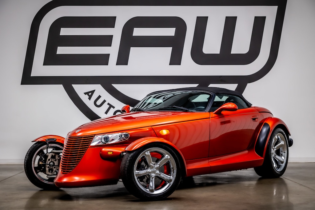 This 2001 Plymouth Prowler finished in striking Prowler Orange Pearl is a true modern hot rod that blends retro-inspired design with reliable Chrysler engineering. Powered by a 3.5L V6 paired to an AutoStick transmission, it delivers smooth acceleration and a balanced driving experience thanks to its lightweight aluminum-intensive construction and rear-mounted transaxle. The unmistakable open front-wheel design, staggered alloy wheels, and aggressive stance make this Prowler a standout anywhere it goes, while the black convertible top and driver-focused cockpit provide classic roadster appeal with everyday comfort. With limited production numbers and timeless styling, this 2001 Prowler is an excellent opportunity for collectors and enthusiasts alike to own one of the most distinctive American performance roadsters ever built. 3.5L high-output V6 engine with 253 hp and a 4-speed automatic transmission with AutoStick manual shift mode, rear-wheel drive, aluminum-intensive chassis with fully independent suspension, staggered chrome alloy wheels (17 front, 20 rear) with high-performance tires, manual folding black convertible soft top with glass rear window and defogger, leather-trimmed low-back reclining bucket seats with embossed Prowler logos, leather-wrapped tilt steering wheel with cruise and audio controls, remote keyless entry with illuminated entry and panic alarm, power windows with driver one-touch down, power door locks and mirrors, air conditioning with rotary climate controls, cruise control, anti-lock 4-wheel vented disc brakes, power rack-and-pinion steering, AM/FM stereo with Infinity premium sound, 6-disc CD changer with 7 speakers and steering-wheel audio controls, tachometer mounted on steering column, full analog instrumentation (150 mph speedometer, gauges for temperature, voltage, oil pressure, odometer with trip), external temperature display, trip computer/message center with warning lamps, auto-dimming rearview mirror, floor mats with Prowler logo, dual front airbags, security system with alarm, rear window defroster, tinted windows, intermittent windshield wipers, front beverage holders and center console storage with armrest, and tire pressure monitoring system.