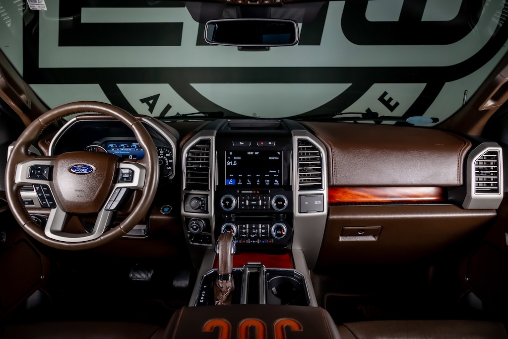 EQUIPMENT GROUP 601A LUXURY Auto High Beam w/Rain-Sensing Windshield Wipers, Power-Deployable Running Boards, Replaces step bar, Wheels: 20 Machined-Aluminum, light Caribou painted pockets and Caribou wheel ornament w/Caribou King Ranch logo, Tailgate Step w/Tailgate Lift Assist, Tires: P275/55R20 OWL Automatic Transmission, 275/65R 18 OWL all-terrain spare tire, Inflatable Rear Safety Belts, Blind Spot Information System (BLIS), cross-traffic alert and trailer tow monitoring (BLIS sensor in LED taillamp), Multi-Contour Driver & Passenger Seats, KING RANCH CHROME APPEARANCE PACKAGE 2 chrome front tow hooks and tailgate applique, Chrome Door Handles w/Body-Color Strap, Bright Belt Moldings, Tires: P275/55R20 OWL Automatic Transmission, 275/65R 18 OWL all-terrain spare tire, Chrome 3-Bar Style Grille w/Chrome Surround, chrome mesh insert, Wheels: 20 Chrome-Like PVD, Caribou wheel ornaments w/King Ranch logo, Chrome Skull Caps on Exterior Mirrors, TWIN PANEL MOONROOF, TRAILER TOW PACKAGE Towing capability up to 11,100 lbs, Engine Oil Cooler, Auxiliary Transmission Oil Cooler, Pro Trailer Backup Assist, Upgraded Front Stabilizer Bar, TRANSMISSION: ELECTRONIC 10-SPEED AUTOMATIC tow/haul mode and sport mode, ENGINE: 3.5L V6 ECOBOOST auto start/stop, ELECTRONIC LOCKING W/3.55 AXLE RATIO