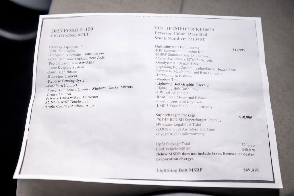 IHC Suspension Lowering Kit, MBRP Stainless Side Exit Exhaust, Vision Switchback 22 x 9.5 Wheels, Goodyear All Season TiresLightning Bolt Custom Leather/Suede Heated Seats, Painted to Match Front and Rear Bumpers, Toff Spray-in Bedliner, Window Tint, Lightning Bolt Graphics Package, Lightning Bolt Dash Plate, 4 Wheel Alignment, Road Force Mount and Balance, Gorilla Lugs with Key Code, LMP 3 Year/36,000 Mile Warranty.