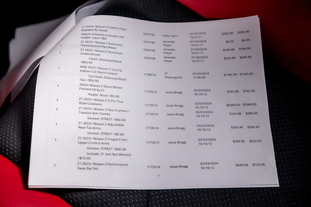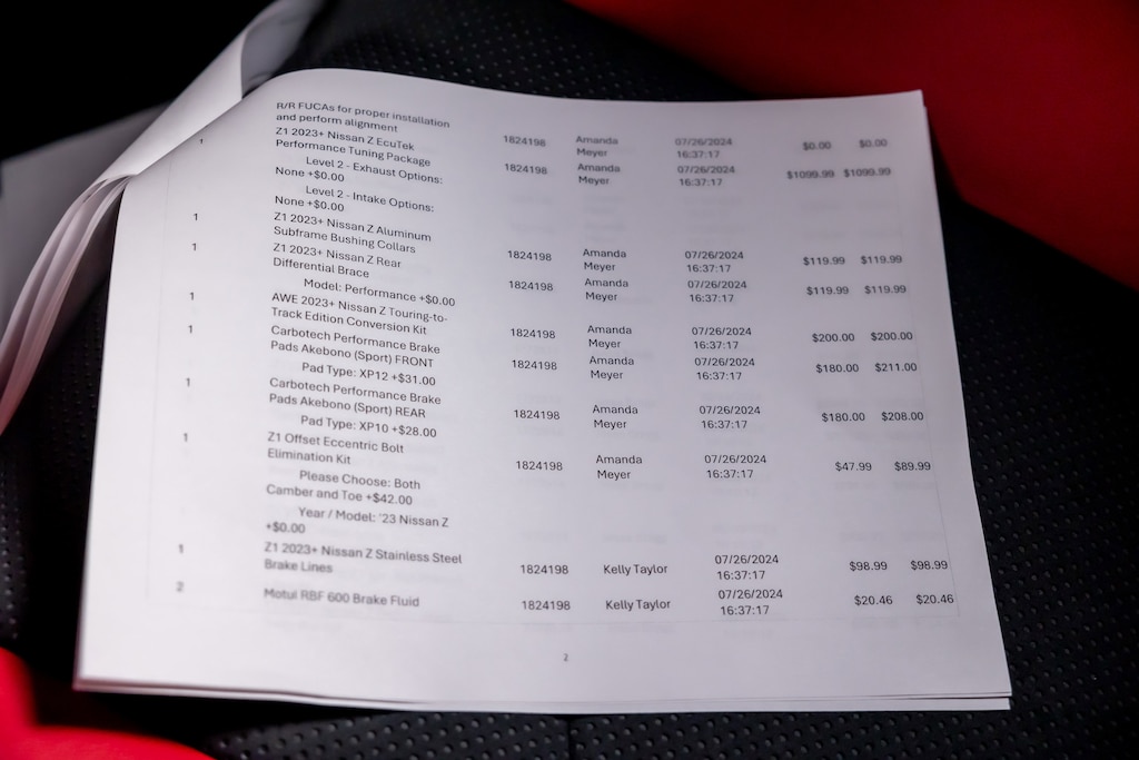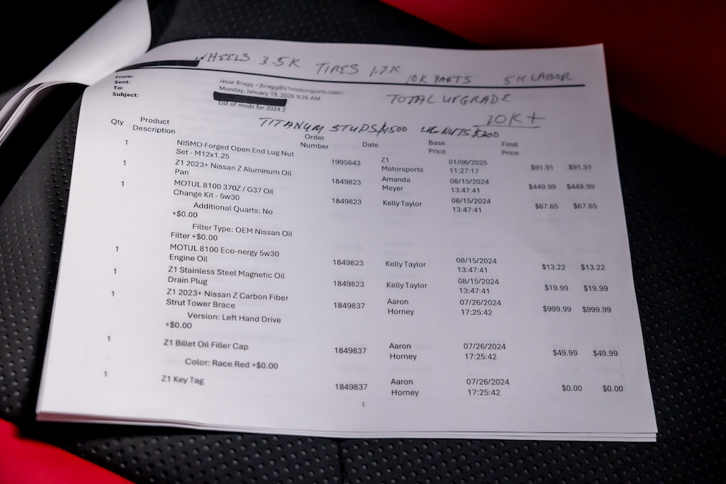 SINGLE OWNER NISSAN Z PERFORMANCE IN GUN METALLIC OVER RED ACCENT. THIS Z IS OFFERED IN EXCELLENT CONDITION WITH A CLEAN CARFAX REPORT. CUSTOM MODIFICATIONS COMPLETE BY Z1 MOTORSPORTS INCLUDE APEX WHEELS IN GOLD WITH MACHINED LIP, MICHELIN PILOT SUPER SPORT TIRES, NISSAN FORGED OPEN END LUG NUTS, NISSAN Z ALUMINUM OIL PAN, Z1 STAINLESS STEEL MAGNETIC OIL DRAIN PLUG, Z1 CARBON FIBER STURT BRACE TOWER, Z1 BILLET OIL FILTER CAP, Z1 EXUTEK TUNING PACKAGE, Z1 ALUMINUM SUBFRAME BUSHING COLLARS, Z1 REAR DIFFERENTAIL BRACE, AWE TOURING-TO-TRACK EDITION CONVERSION KIT, CARBOTECH PERFORMANCE BRAKES PADS FRONT AND REAR, Z1 OFFSELT ECCENTRIC BOLT ELIMINATION KIT, Z1 STAINLESS STEEL BRAKE LINES, Z1 CARBON FIBER RADIATOR AIR GUIDE, Z1 AUTOMATIC TRANSMISSION PAN SHIELD, Z1 ALUMINUM UNDERSHROUD, AWE TOURING EDTION CAT-BACK EXHAUST WITH DIAMOND BLACK TIPS, Z1 STOCK WHEEL FITMENT KIT, Z1 R-PRO TRUE STYLE COILOVERS, Z1 REAR CAMBER TRACTION ARM COMBO, Z1 ADJUSTAMBE REAR TOW ARMS, Z1 FORGED FRONT UPPER CONTROL ARMS AND Z1 PERFORMANCE SWAY BAR SET. OVER $20,000 IN MODIFICATIONS.